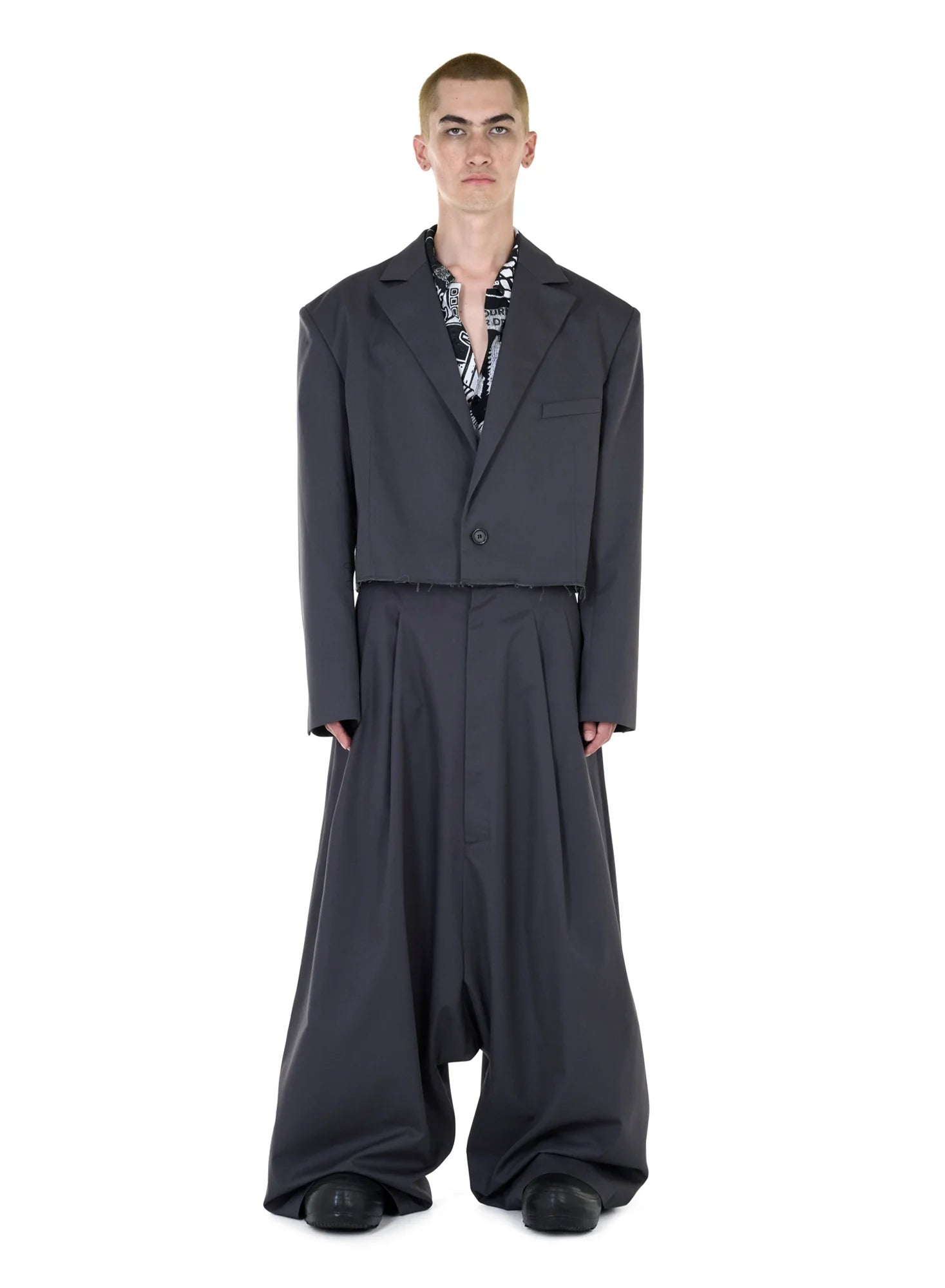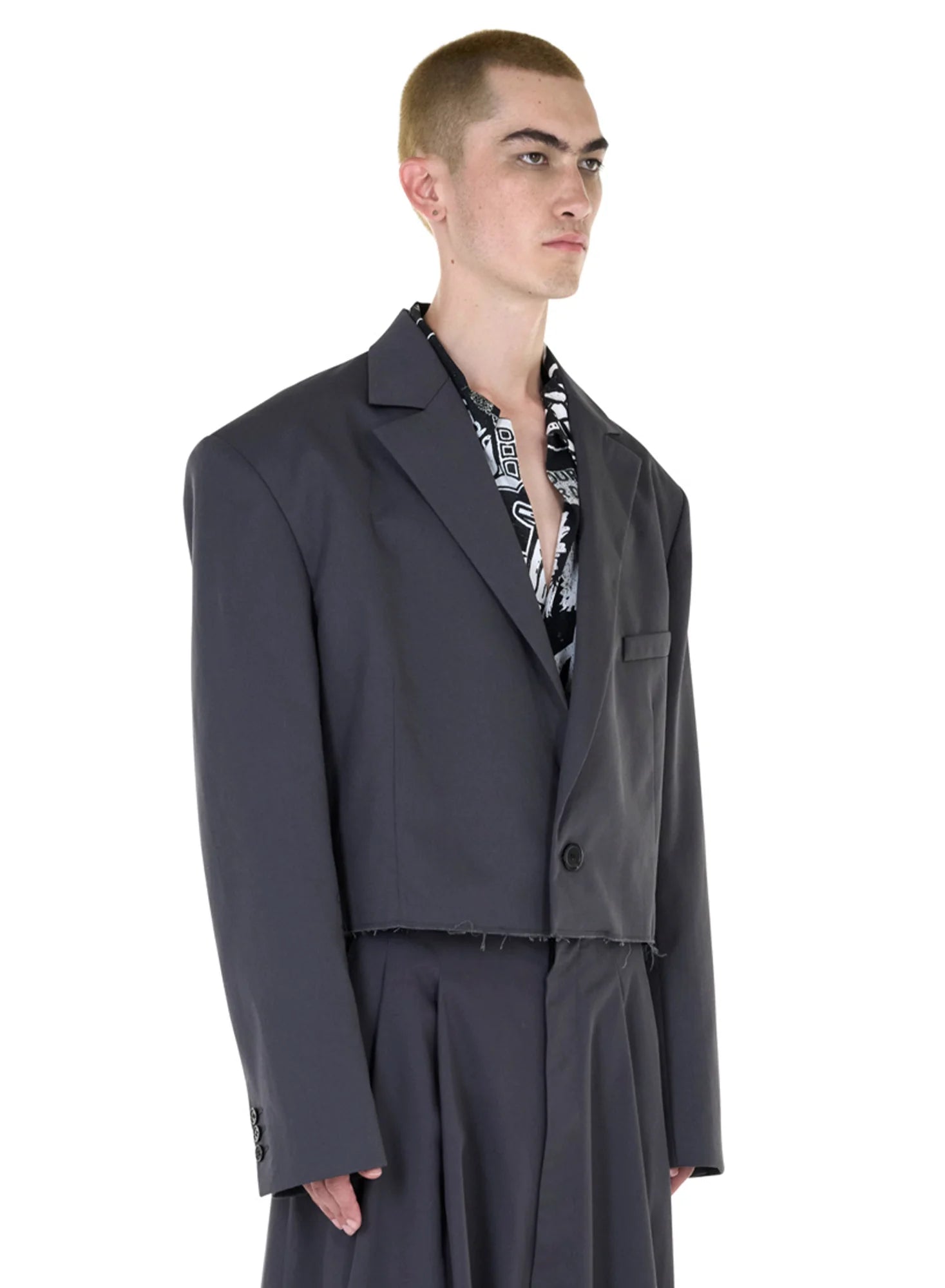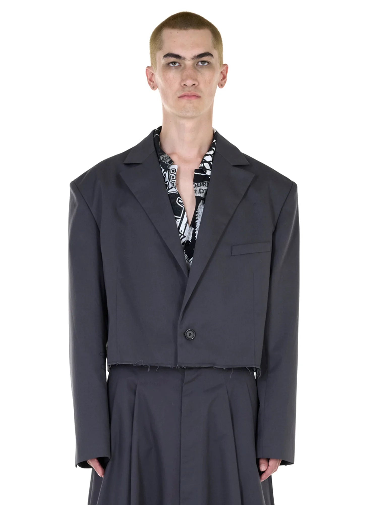 INSPIRED BY THE VISUAL LANGUAGE OF JAPANESE UNIFORM, THIS BLAZER EFFORTLESSLY BALANCES SOPHISTICATION WITH A TOUCH OF UNCONVENTIONALITY. FEATURING A SLIGHTLY CROPPED CUT WITH A RAW HEM, THE PIECE ELONGATES THE WEARERS REACH TO ENSURE FOR A MORE DISTINCT LOOK. MODELS WEARS A SIZE 48.